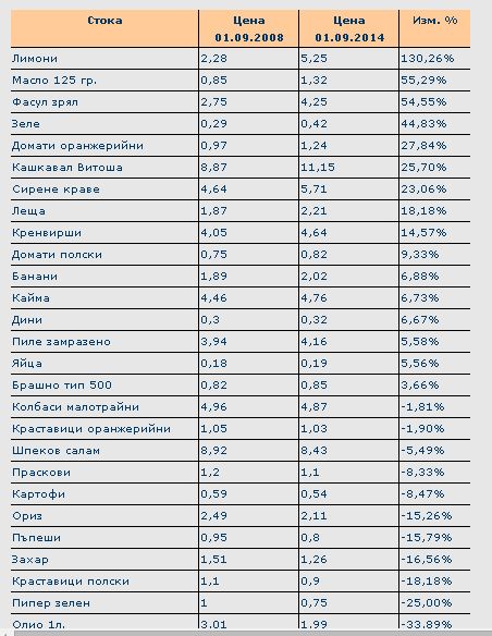 Ето как са се променили цените на основните хранителни продукти от началото на септември на 2008 година (първата година, за която има статистика от Държавната комисия по стоковите борси и тържища) до началото на септември на настоящата година: