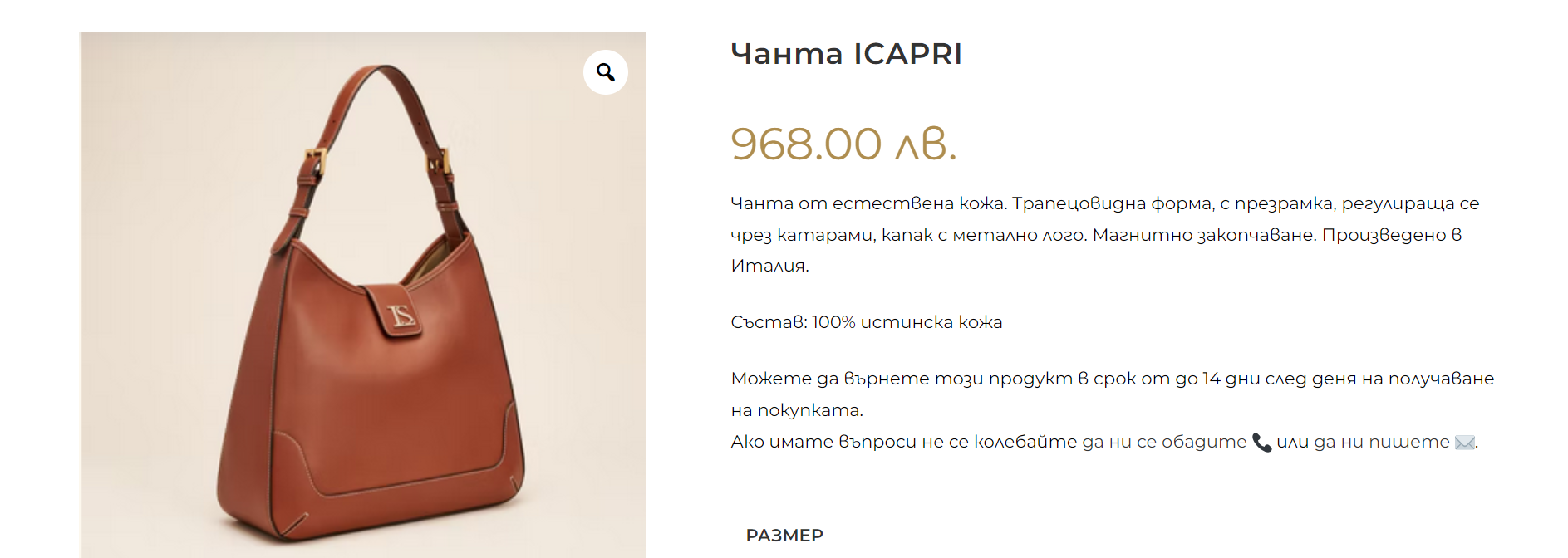 Роклята, която всъщност е определена от дизайнера като туника, е дело на италианската модна къща „Луиза Спаньоли“. Марката не е сред най-комерсиалните и популярни у нас, но цените ѝ са изключително завишени. Бутикът им в София се намира на бул. „Витоша“, а Нинова е редовен техен клиент. Флоралната ѝ рокля вече е изчерпана от наличност в България, но проверка в международната търговска мрежа на марката показва, че цената ѝ е 410 евро, или над 800 лева. За посещението си в Кюстендил соцлидерката я бе комбинирала със спортни бели кецове и дамска чанта тип „торба“. Аксесоарът обаче се оказа дори по-скъп от роклята ѝ. Той отново е на марката „Луиза Спаньоли“ и е част от най-новата им колекция. Справка в техния онлайн магазин показва, че цената ѝ за българския пазар е 968 лева. Произведена е в Италия от 100% естествена кожа. Отличава се с трапецовидна форма, с презрамка, регулираща се чрез катарами, капак с метално лого и магнитно закопчаване. Освен в кафяво се предлага и в син нюанс, който е възможно Нинова също да си е закупила, тъй като синьото е сред любимите ѝ цветове и често си подбира тоалети именно в тази гама.