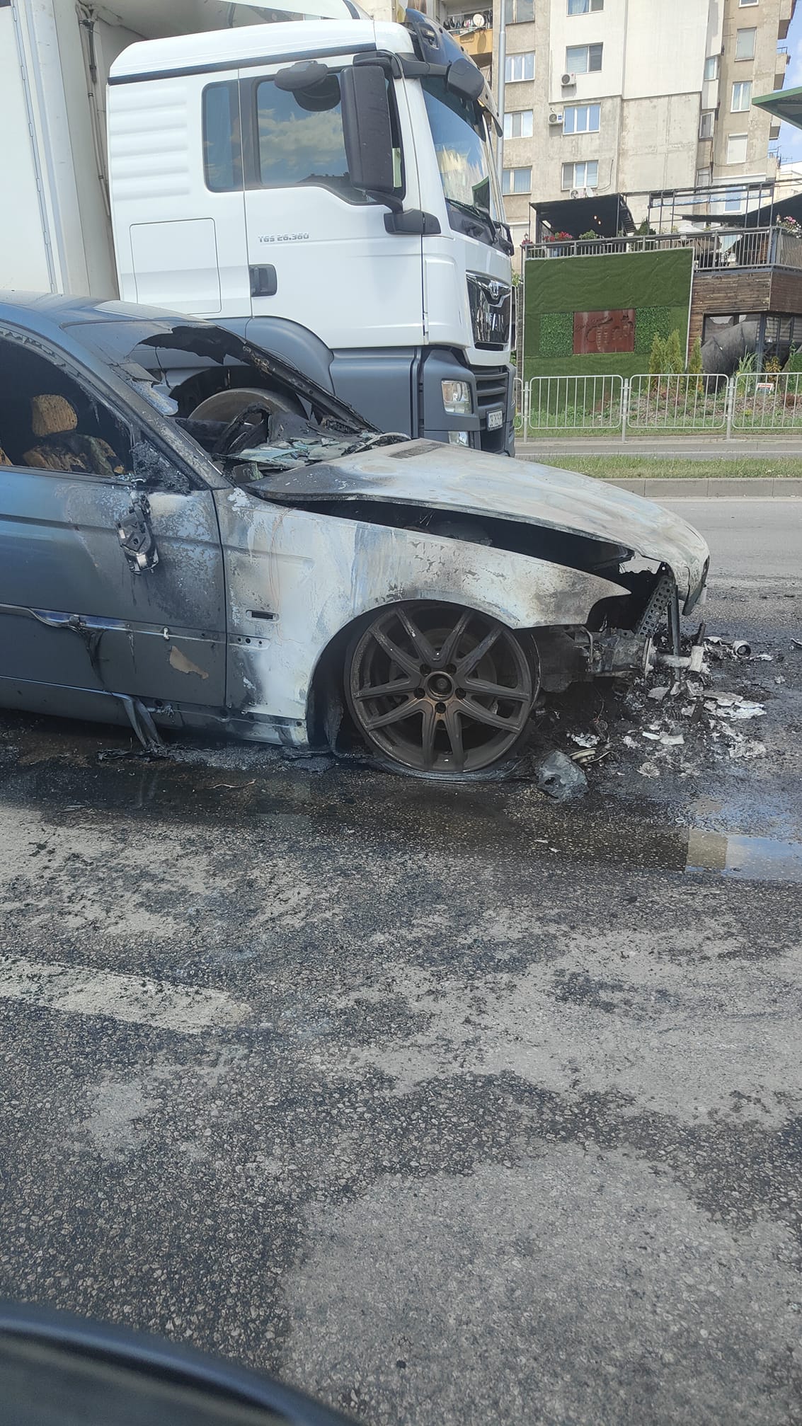 Кола пламна и изгоря в жегата на бул. Ломско шосе в столицата днес в следобедните часове. Кадри от мястото публикуват очевидци в социалните мрежи.