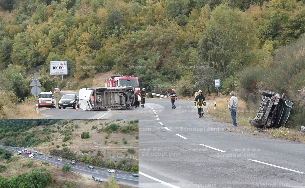 АД НА ПЪТЯ! Бус се обърна край Кърджали, кола след него се преобърна в канавка (ВИДЕО/СНИМКИ)