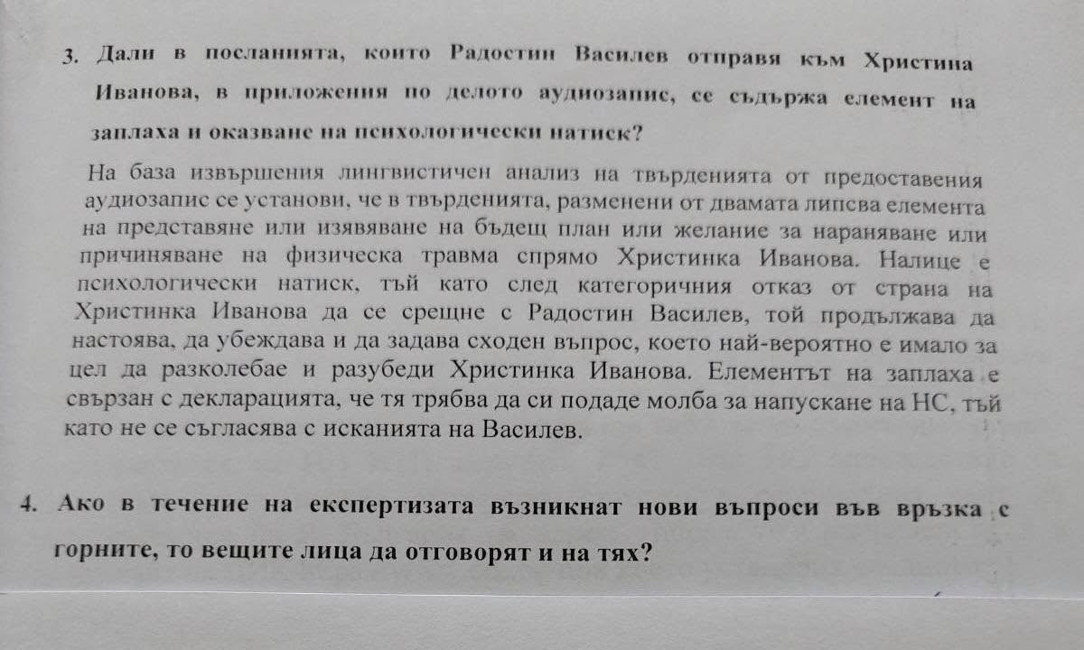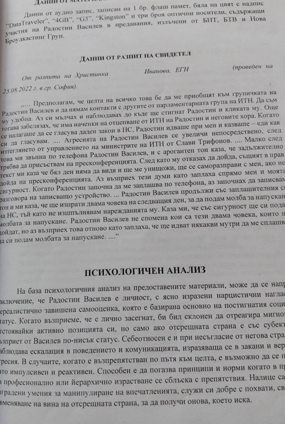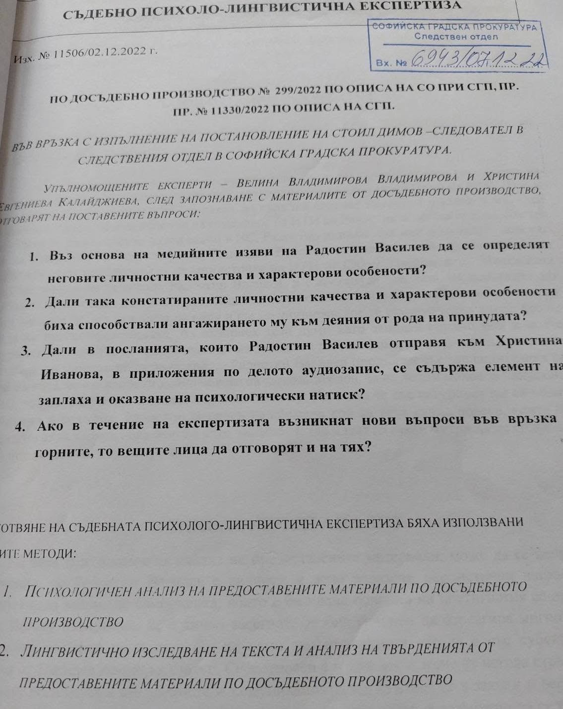 Експертизата е по досъдебно производство № 299/22 г., по което Радостин Василев е подсъдим за отправени от него на 13 юни 2022 година заплахи, с които се е опитал да принуди депутатката Христинка Иванова да напусне парламентарната група на "Има такъв народ" и 47-ото Народно събрание.