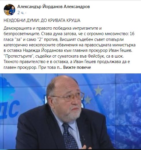 "Демокрацията и правото победиха интригантите и безпросветниците", написа във "Фейсбук" евродепутатът Александър Йорданов. Поводът огромнотго мнозинство, с което ВСС остави Гешев главен прокурор.