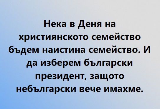 Нека в Деня на християнското семейство бъдем наистина семейство. И да изберем български президент, защото небългарски вече имахме. Това написа на страницата си във Фейсбук евродепутатът Александър Йорданов.
