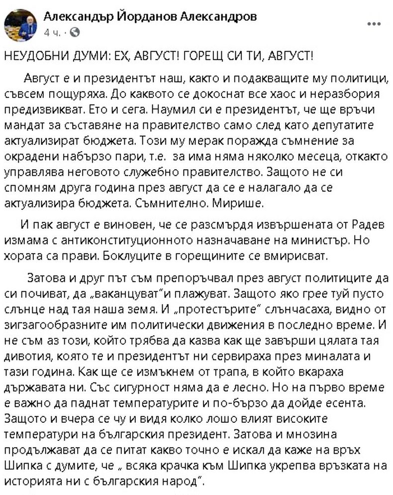 Александър Йорданов със силни думи: Август е и президентът наш, както и подакващите му политици, съвсем пощуряха