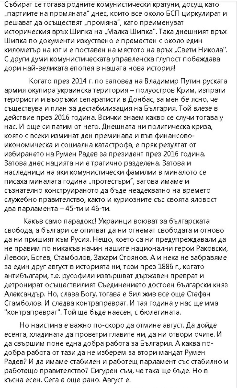 Когато през 2014 г. по заповед на Владимир Путин руската армия окупира украинска територия – полуостров Крим, изпрати терористи и въоръжи сепаратисти в Донбас, за мен бе ясно, че съществува и план за дестабилизация на България. Той влезе в действие през 2016 година. Всички знаем какво се случи тогава у нас. И още си патим от него. Днешната ни политическа криза, която с всеки изминат ден преминава и във финансово-икономическа и социална катастрофа, е пряк резултат от избирането на Румен Радев за президент през 2016 година. Затова днес нацията ни е трагично разделена. Затова и наследници на яки комунистически фамилии в миналото се писаха миналата година „протестъри”, затова имаме и съзнателно конструираното да бъде неадекватно на времето служебно правителство, както и куриозните със своята яловост два парламента – 45-ти и 46-ти.