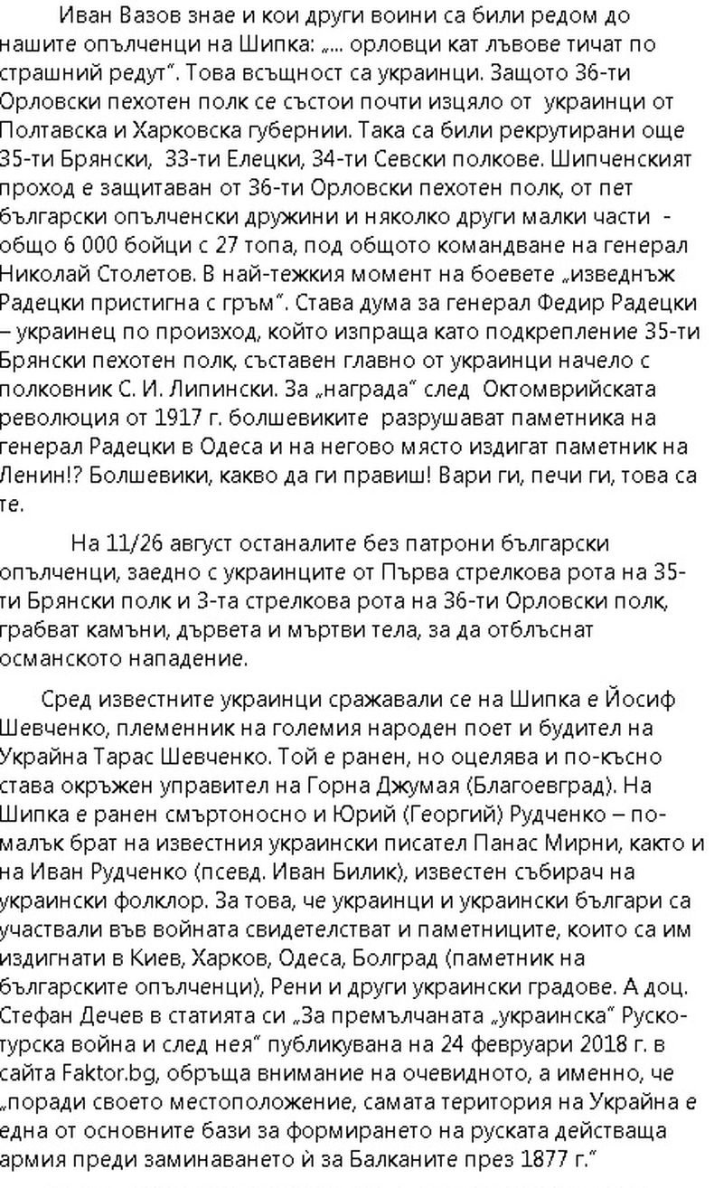 Иван Вазов знае и кои други воини са били редом до нашите опълченци на Шипка: „... орловци кат лъвове тичат по страшний редут”. Това всъщност са украинци. Защото 36-ти Орловски пехотен полк се състои почти изцяло от  украинци от Полтавска и Харковска губернии. Така са били рекрутирани още 35-ти Брянски,  33-ти Елецки, 34-ти Севски полкове. Шипченският проход е защитаван от 36-ти Орловски пехотен полк, от пет български опълченски дружини и няколко други малки части  - общо 6 000 бойци с 27 топа, под общото командване на генерал Николай Столетов. В най-тежкия момент на боевете „изведнъж Радецки пристигна с гръм”. Става дума за генерал Федир Радецки – украинец по произход, който изпраща като подкрепление 35-ти Брянски пехотен полк, съставен главно от украинци начело с полковник С. И. Липински. За „награда” след  Октомврийската революция от 1917 г. болшевиките  разрушават паметника на генерал Радецки в Одеса и на негово място издигат паметник на Ленин!? Болшевики, какво да ги правиш! Вари ги, печи ги, това са те.
