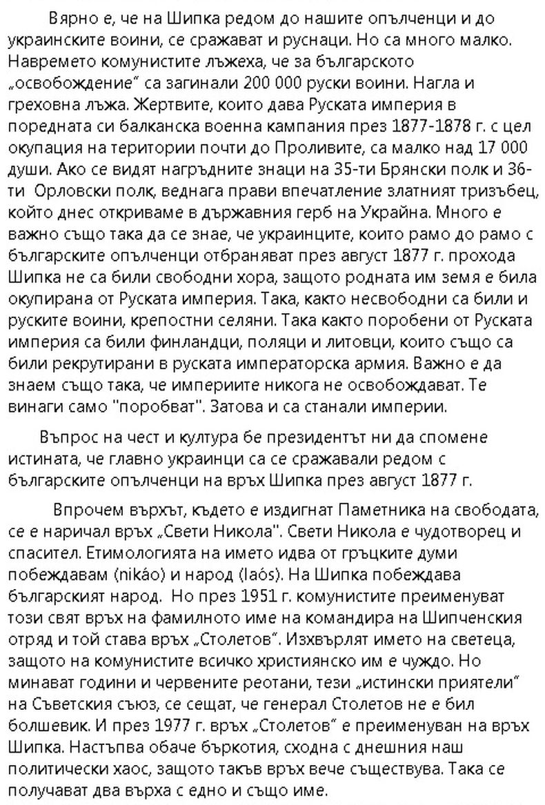 Въпрос на чест и култура бе президентът ни да спомене истината, че главно украинци са се сражавали редом с българските опълченци на връх Шипка през август 1877 г.