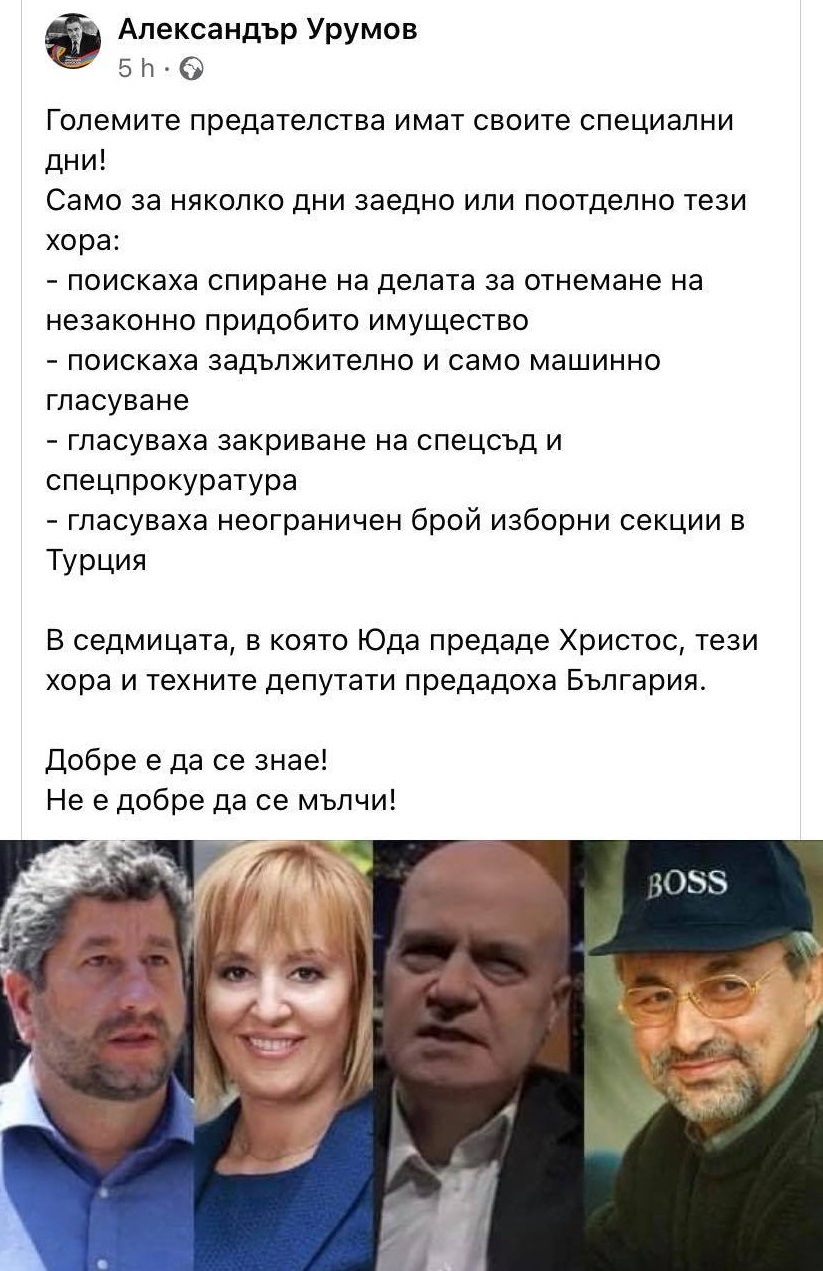Александър Урумов: В седмицата, в която Юда предаде Христос, тези хора и техните депутати предадоха България