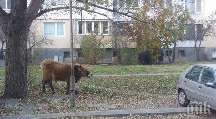 ТОТАЛЕН ШОК В СОФИЯ! Крави и телета пасат пред блок (СНИМКА)