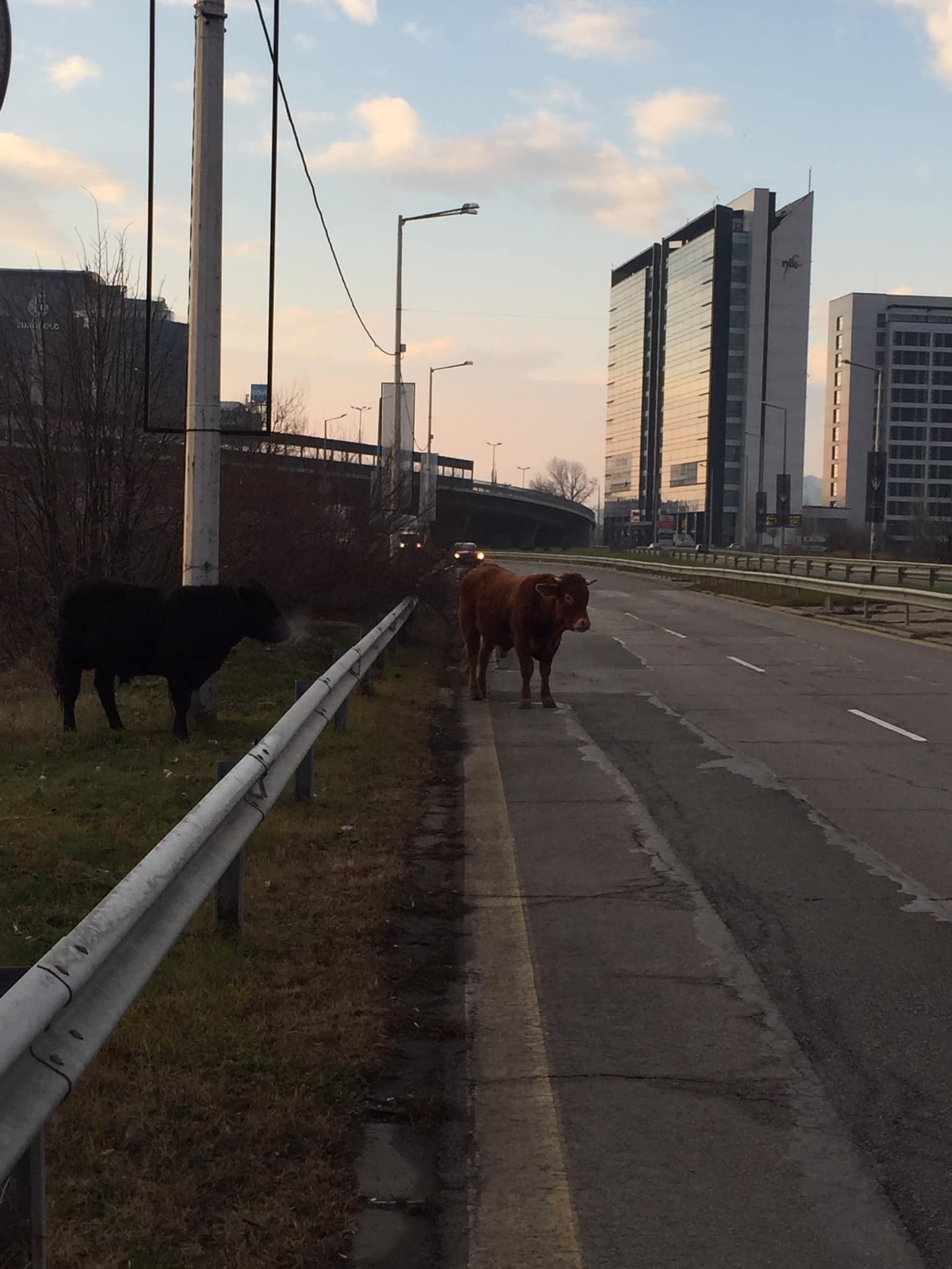 АЛО, КМЕТЕ: Крави пасат кротко по булеварда към летище София (СНИМКА)