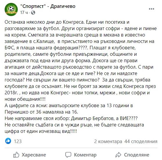 Докога ще се прави агитация от действащото ръководство с парите за футбол. С пари за нашите деца. Докога ще се яде и пие? Не се ли наядохте, господа? Не свърши ли вашето пиянство? За да свърши, трябва клубовете да се осъзнаят. Не ни броят за живи след Конгреса през 2018 г., но идва нов Конгрес - нови топки, мрежи, нови софри и нови обещания!!!!