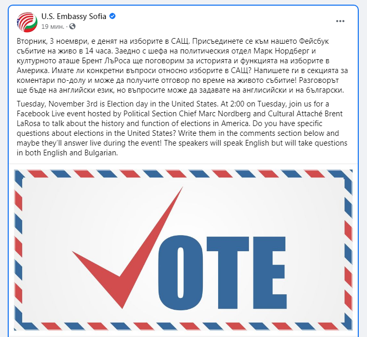 "Заедно с шефа на политическия отдел Марк Нордберг и културното аташе Брент ЛъРоса ще поговорим за историята и функцията на изборите в Америка. Имате ли конкретни въпроси относно изборите в САЩ? Напишете ги в секцията за коментари по-долу и може да получите отговор по време на живото събитие! Разговорът ще бъде на английски език, но въпросите може да задавате на англисийски и на български", обясняват от посолството.