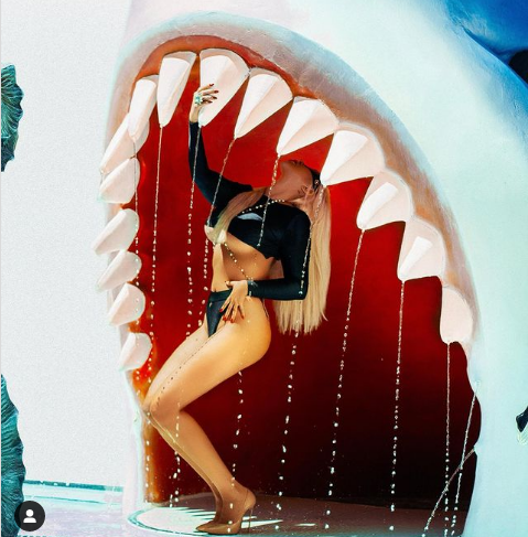 За успокоение на почитателите на изпълнителката обаче, морското чудовище е само макет, а снимката вероятно е запечатана в някой аквапарк.