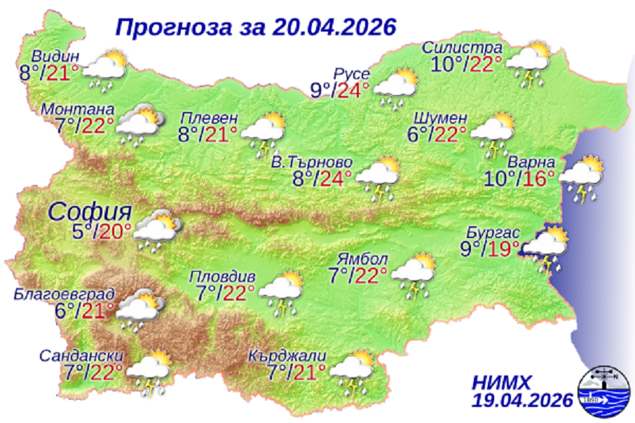 Максималните температури ще бъдат между 19° и 24°, по Черноморието - между 15° и 19°, в София – около 20°, прогнозират от НИМХ.
