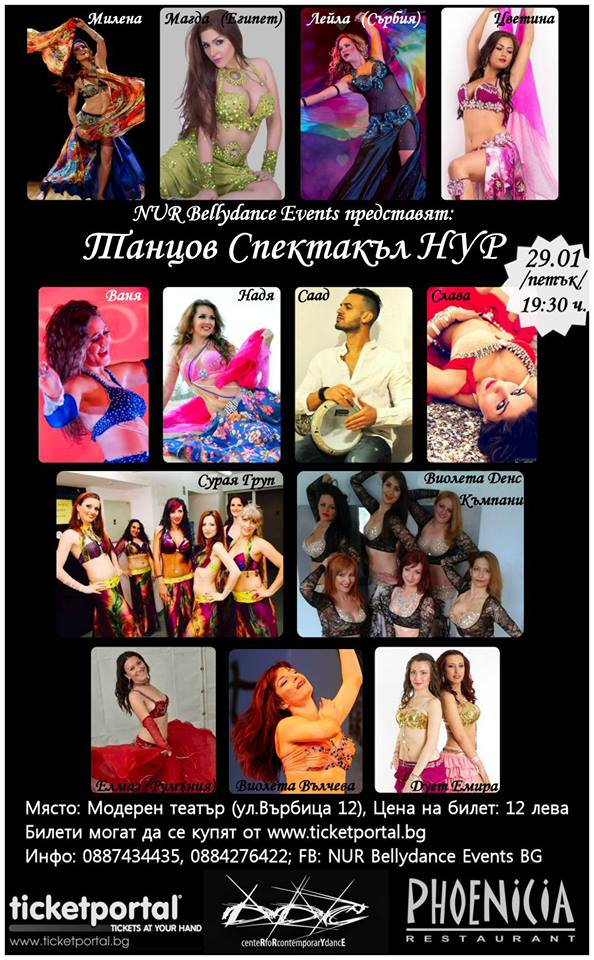 Ориенталски ритми и танци ще изпълнят сцената на Модерен театър в София на 29 януари, петък, от 19:30 ч. В ориенталския танцов спектакъл ‘’НУР’’ ще се включат голям брой танцьори и музиканти. На концерта ще участват артисти от България, Египет, Аржентина, Ирак, Сърбия, Румъния, Македония и Беларус.