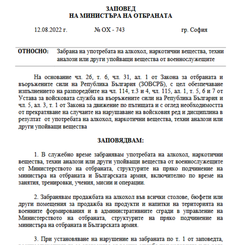 "В служебно време забранявам употребата на алкохол, наркотични вещества, техни аналози или други упойващи вещества от военнослужещите от Министерството на отбраната, структурите на пряко подчинение на министъра на отбраната и Българската армия, включително по време на занятия, тренировки, учения, мисии и операции".
