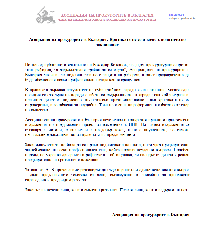 Асоциацията на прокурорите в България вече изложи конкретни правни и практически възражения по предложения проект за изменения в НПК. На такива възражения се отговаря с мотиви, с анализ и с по-добър текст, а не с внушението, че самото несъгласие е доказателство за правотата на предложението.