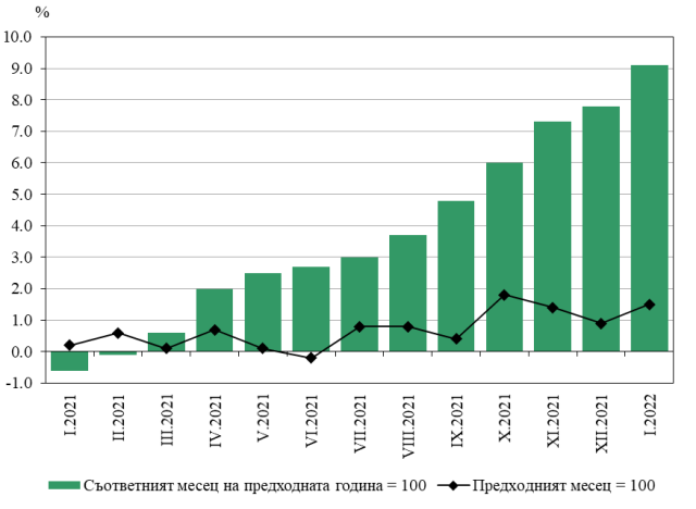 Годишната инфлация за януари 2022 г. спрямо януари 2021 г. е 9,1%. Това показват данни на Националния статистически институт. Това е най-високото темпо на поскъпване от ноември 2008 г., когато бяха отчетени същите стойности.