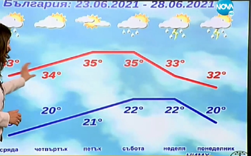 Горещото време ще продължи до края на седмицата. Това обяви пред Нова тв синоптикът от НИМХ Анастасия Стойчева. В четвъртък и петък се очаква температурите да стигнат до 39-40 градуса. Въпреки това, няма да има рекорди.