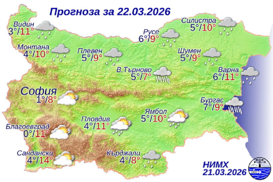 Минималните температури ще бъдат между 0° и 5°, по високите котловинни полета на Западна България до минус 2°, а в София – около 1°. Максималните температури ще бъдат предимно между 7° и 12°, в София - около 8°, прогнозират за днес от НИМХ.