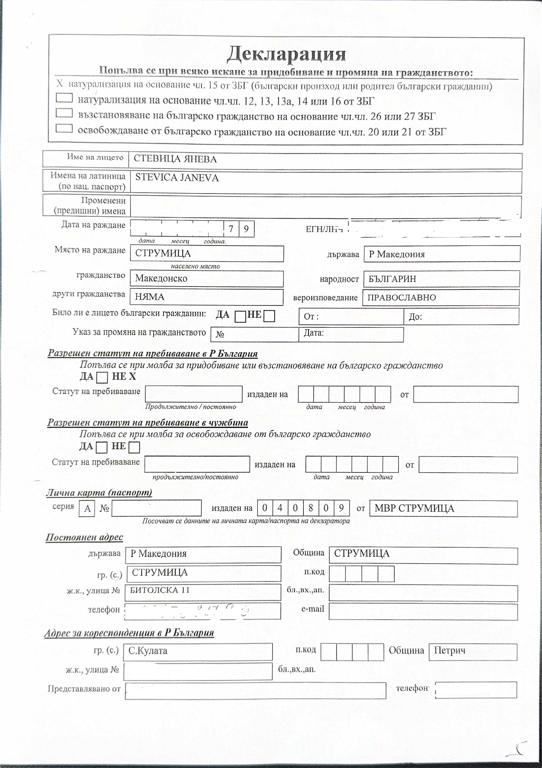 Нещо повече – в декларацията за кандидатстване за гражданство Стевица Янева посочва, че майка ѝ, баща ѝ, двете ѝ деца и сестра ѝ са българи по народност от Струмица. В интервюто, проведено пред българските власти, балдъзата на настоящия македонски премиер разказва, че има роднини в село Брезница, Петрич и София. Съпругът ѝ Йорданчо Янев също е получил български документи през 2016 година.