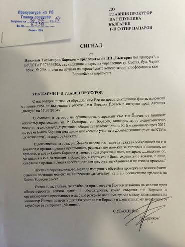 Лидерът на ББЦ изпрати и сигнал до Главния прокурор Сотир Цацаров с искане да се извърши обстойна проверка на всички факти относно началния момент на „източване“ на КТБ, респективно връзката на Бойко Борисов с него. „Освен това, считам, че трябва да призовете г-н Йовчев детайлно да изложи пред обществеността всички факти и обстоятелства, които свързват г-н Борисов с организираната престъпност и да бъде разкрито дали има връзка между изказванията на министър Йовчев за агентурната битност на г-н Борисов и агентурният му псевдоним от службите за сигурност „Мазника“, пише в сигнала до Цацаров.