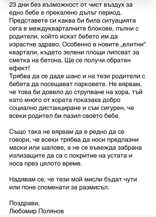Трябва да се даде шанс и на тези родители с бебета да посещават парковете. Не вярвам, че това би довело до струпване на хора, тъй като много от хората показаха добро социално дистанциране и съм сигурен, че всеки родител би пазил своето бебе.