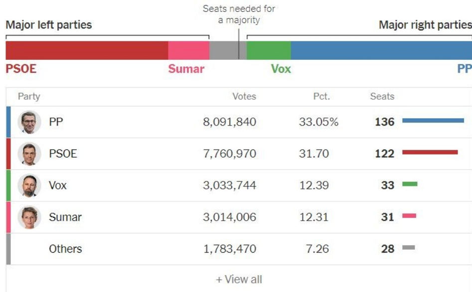 След преброяването на 98 процента от гласовете Народната партия е на път да получи 136 места. Дори с 33-те места, които крайнодясната партия "Вокс" би могла да получи, и едно място, което би могла да вземе от друга съюзническа партия, на Народната партия все още няма да достигнат 7 места, за да има абсолютно мнозинство.