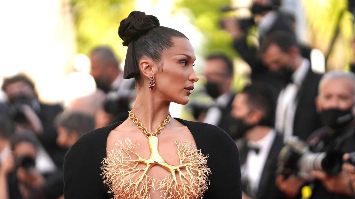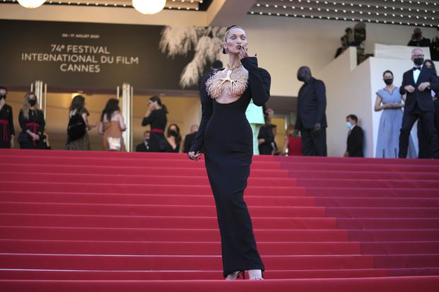 Супермоделът Бела Хадид се разходи в екстравагантно облекло на червения килим в рамките на филмовия фестивал в Кан. 24-годишната красавица посети премиерата на филма Three Floors в дълга черна рокля.