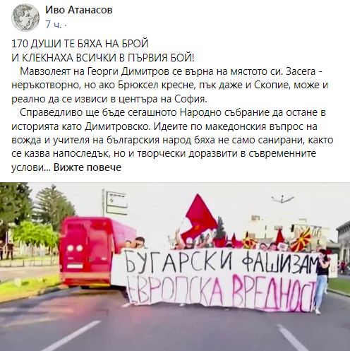"Мавзолеят на Георги Димитров се върна на мястото си. Засега - неръкотворно, но ако Брюксел кресне, пък даже и Скопие, може и реално да се извиси в центъра на София." Това написа в профила си във "Фейсбук" бившият депутат от БСП Иво Атанасов. "Идеите по македонския въпрос на вожда и учителя на българския народ бяха не само санирани, както се казва напоследък, но и творчески доразвити в съвременните условия от повечето наши депутати", поясни той.