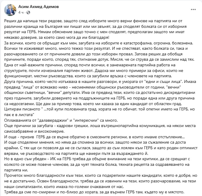 Бившият евродепутат от ГЕРБ/ЕНП Асим Адемов събра смелост да обобщи основните причини за слабия резултат на партията на изборите в неделя. Адемов, който беше съветник на Росен Желязков, правилно търси причините за срива не във външни фактори, а във вътрешни.
