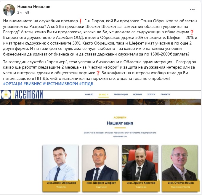 "А кой ви предложи Шефкет Шефкет за заместник областен управител на Разград? А тези, които ви ги предложиха, казаха ли ви, че двамата са съдружници в обща фирма? Въпросното дружеството е Асембли ООД, в което Обрешков държи 50% от акциите, Шефкет - 20%, и имат трети съдружник с останалите 30%. Както Обрешков, така и Шефкет имат участия в по още 2 други фирми. И на този фон се чудя, ама се чудя стабилно - за какво им е на такива успешни бизнесмени да излизат от бизнеса си и да стават държавни служители за по 1500-2000€ заплата?