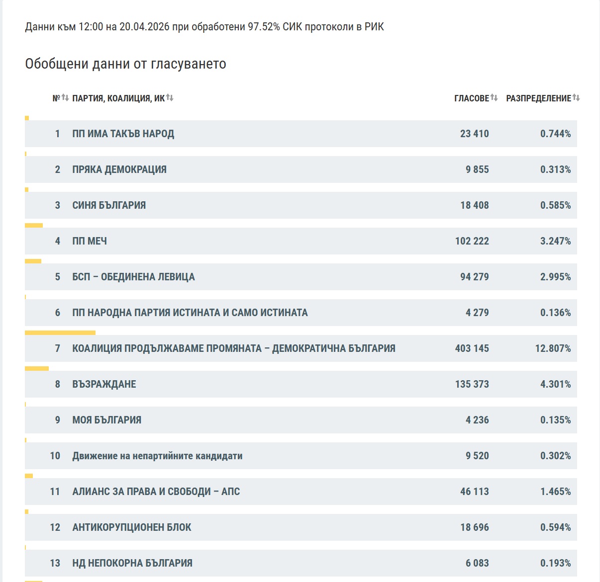Централната избирателна комисия публикува на сайта си нови междинни резултати при обработени 97.52% протоколи. Данните са към 12 часа тази сутрин.
