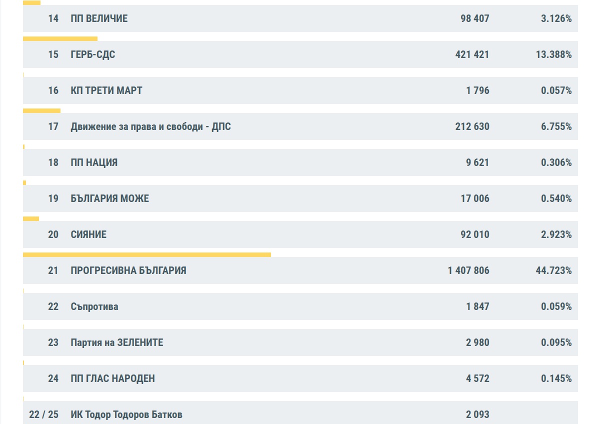 Победител е "Прогресивна България" с 44.72% или 1 407 806 гласа. ГЕРБ запазва инфарктно второто място с резултат от 13.39% или 421 421 гласа. Остава интригата дали ППДБ ще успее в последния момент да измести ГЕРБ. Коалицията на Асен Василев и Мирчев взима 12,81% или 403 145 гласа. Това прави разлика от около 18 000 гласа. Предвид малкото оставащи протоколи, които да бъдат обработени обаче, едвали ще настъпи разместване.
