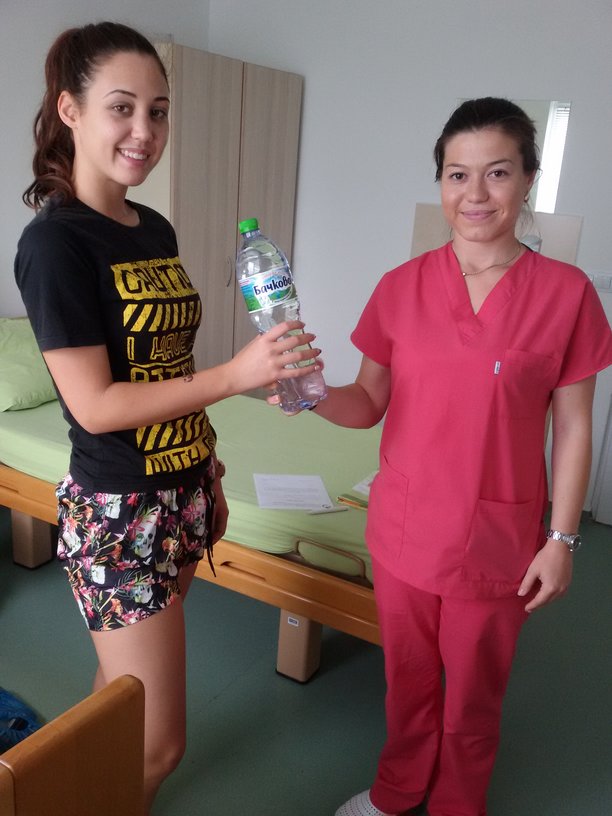 Пациентка получава бутилка изворна вода "Бачково" след успешното си лечение и изписване от Клиника в УМБАЛ "Софиямед"
