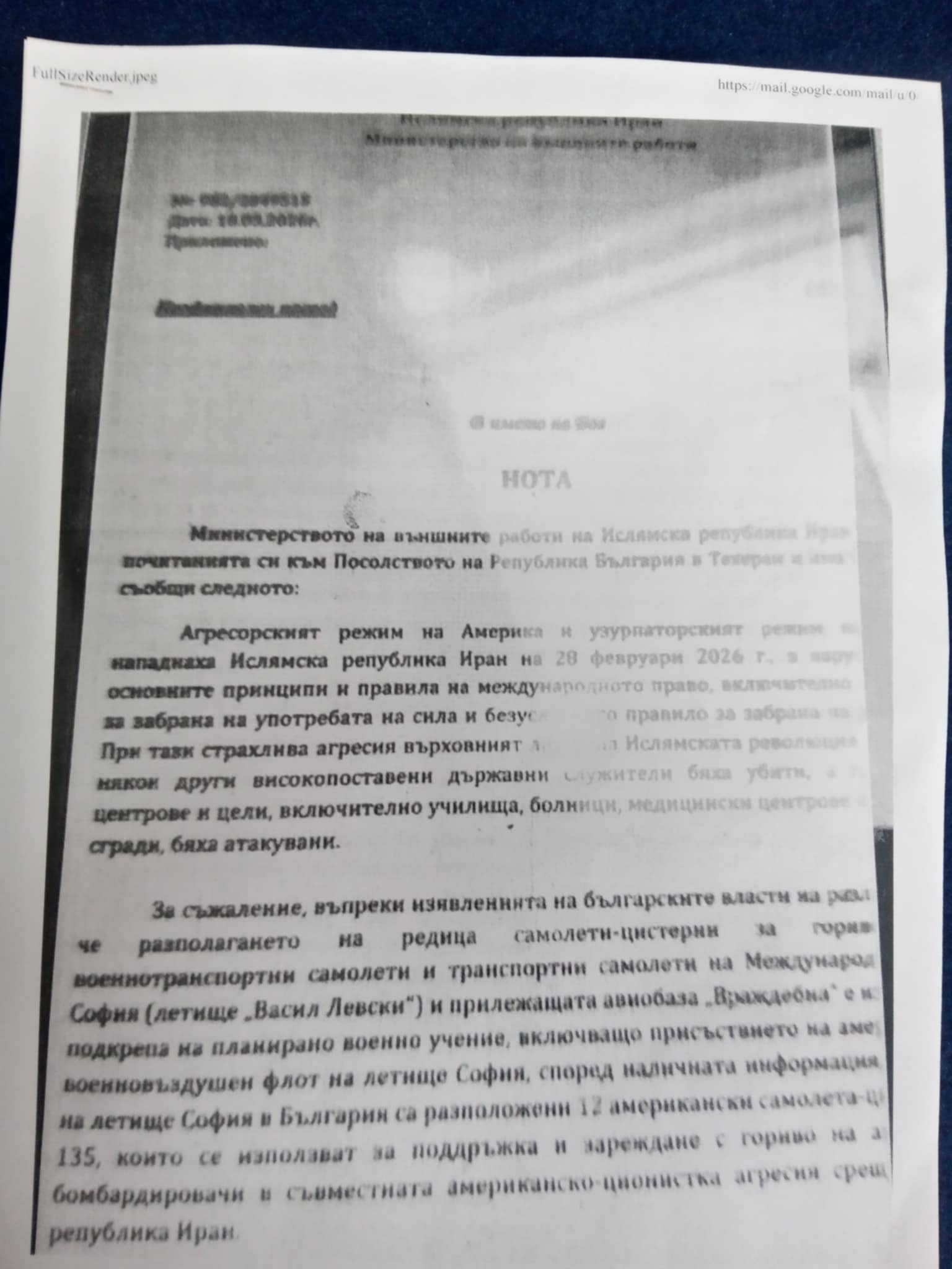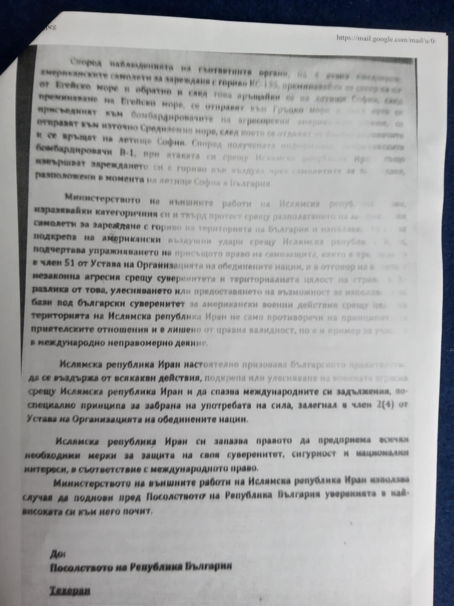 Второ - госпожо президент, в ръцете си държа един друг документ. Това е един скандален документ, един плашещ документ. Той беше изпратен до нас и ние от ИТН питаме - този документ истински ли е или не е. Защото според нас той е истински. Този документ е нота от Ислямска република Иран до МВнР на България от 18 март 2026 г.