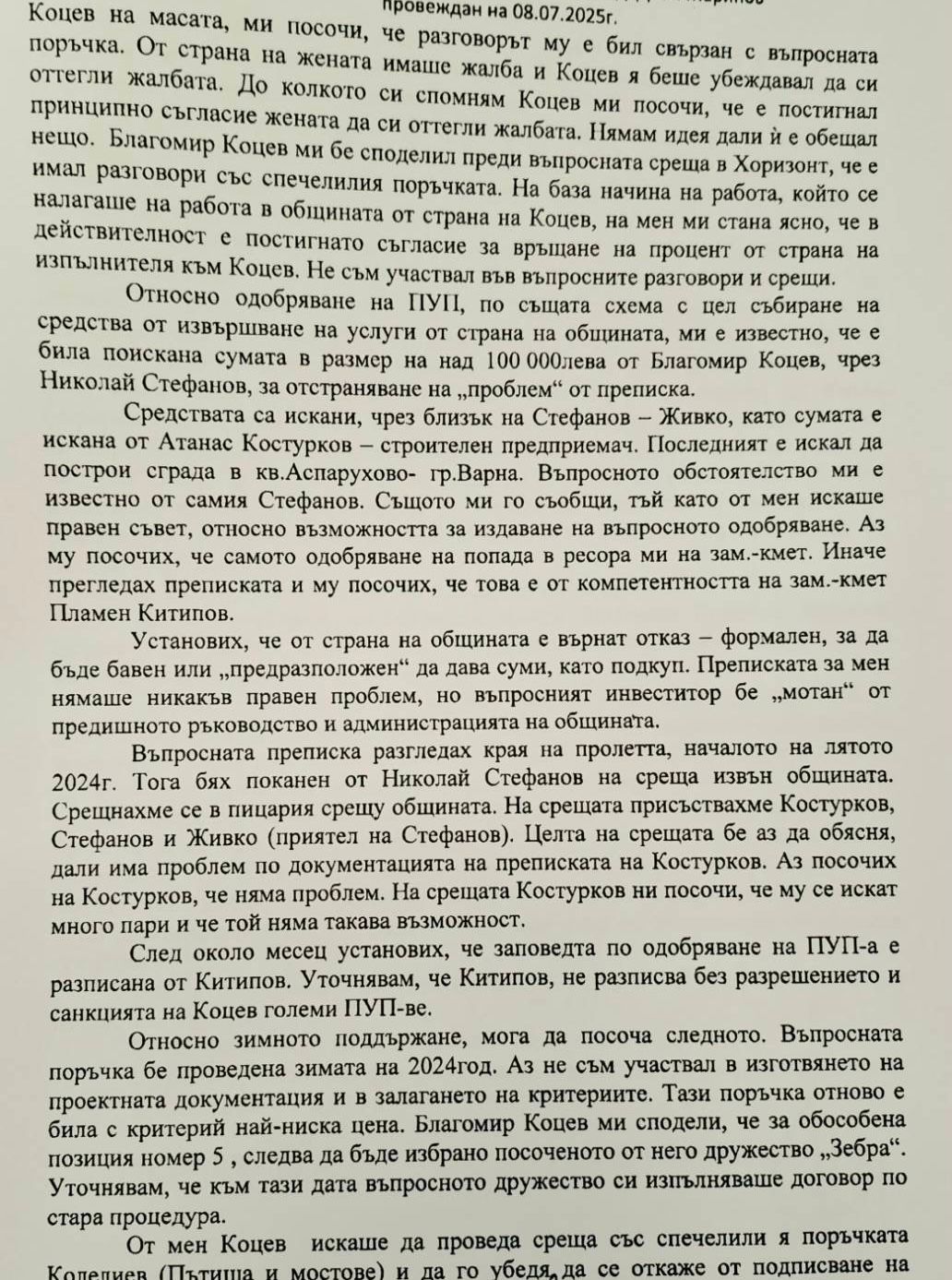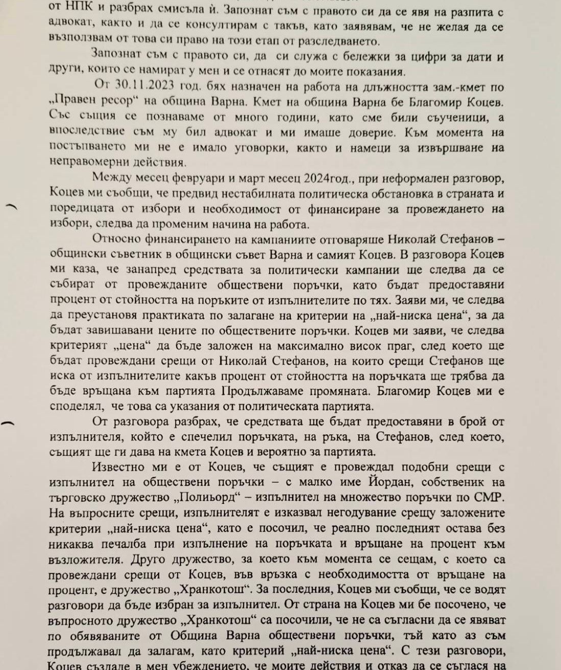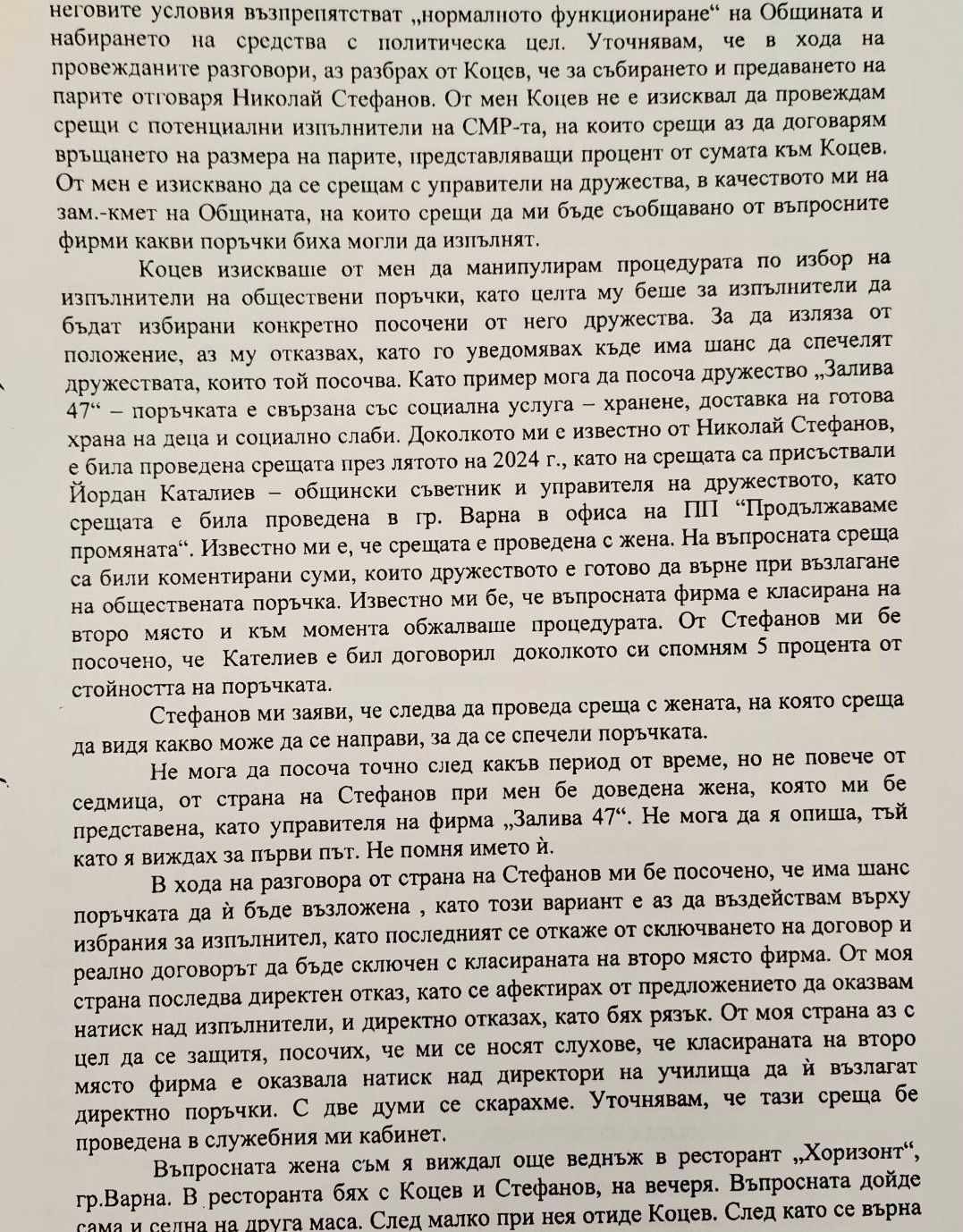 Уточнявам, че в хода на провежданите разговори, аз разбрах от Коцев, че за събирането и предаването на парите отговаря Николай Стефанов. От мен Коцев не е изисквал да провеждам срещи с потенциални изпълнители на СМР-та, на които срещи аз да договарям връщането на размера на парите, представляващи процент от сумата към Коцев.