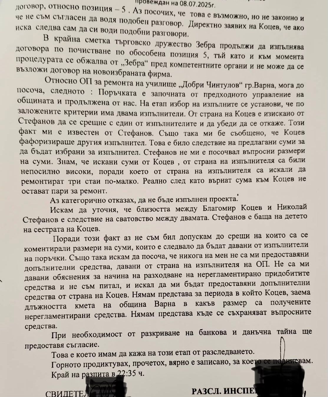Относно ОП за ремонта на училище „Добри Чинтулов" гр.Варна, мога до посоча следното: Поръчката е започната от предходното управление на общината и продължена от нас. На етап избор на изпълнител се установи, че по заложените критерии има двама изпълнители. От страна на Коцев е изискано от Стефанов да се срещне с един от изпълнителите и да го убеди да се откаже. Този факт ми е известен от Стефанов. Също така ми бе съобщено, че Коцев фаворизираше другия изпълнител. Това е било вследствие на предлагани суми, за да бъдат избрани за изпълнител. Стефанов не ми е посочвал размери на суми. Знам, че искани суми от Коцев, от страна на изпълнителя са били непосилно високи, поради което от страна на изпълнителя са искали да ремонтират три стаи по-малко. Реално след като върнат сума към Коцев, не остават пари за ремонт.
