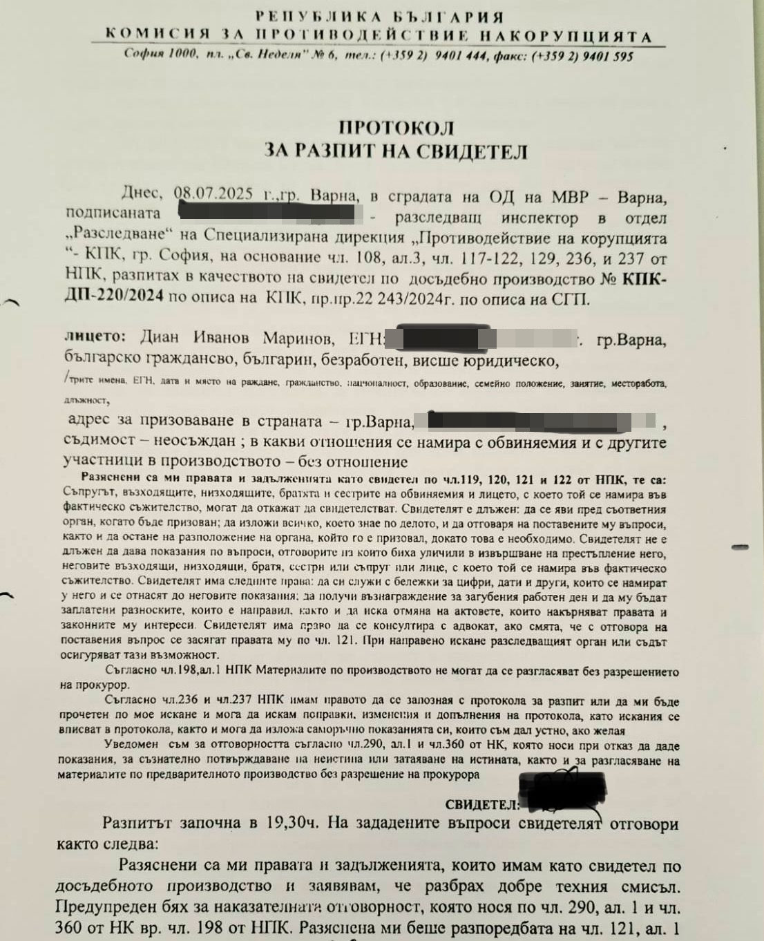 Соня Колтуклиева се сдоби с двата протокола от разпитите на Диан Иванов Маринов. Прави впечатление, че на 9 юли, той потвърждава и разширява казаното на 8 юли. И никъде не се оплаква, че е притискан и заплашван.