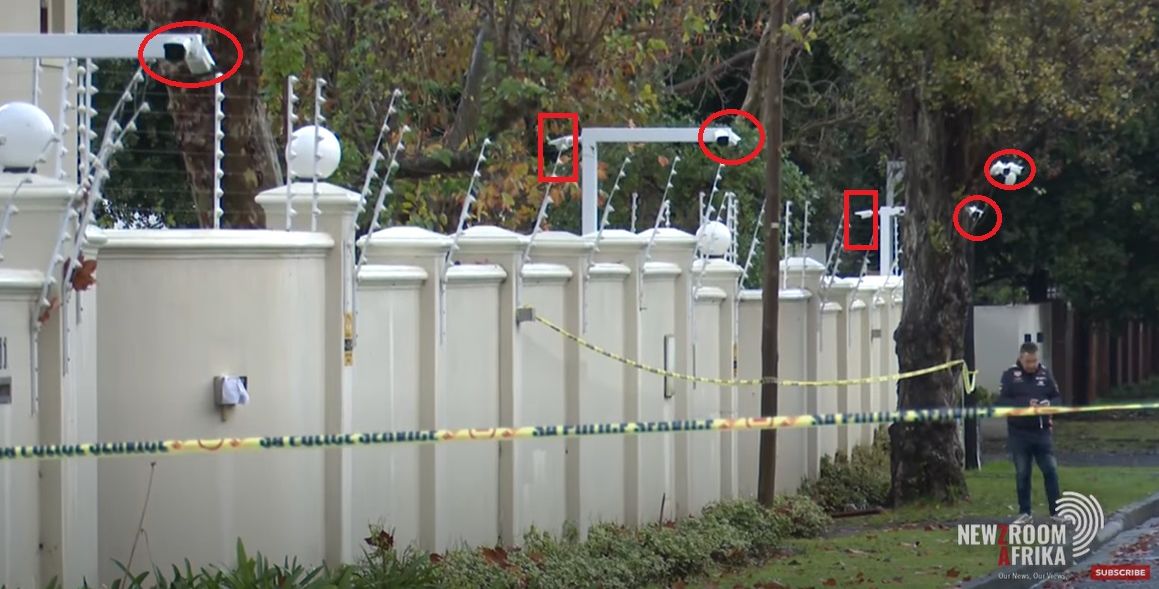 От ъгъла, от който операторът на южноафриканската телевизия е бил допуснат да заснеме мястото на произшествието, изглежда, че през около 5-6 метра за случващото се на улицата са следели куп камери. Само на стоп кадъра долу ПИК преброи цели 10 - и то само на част от фронталната стена на резиденцията на Каменов.