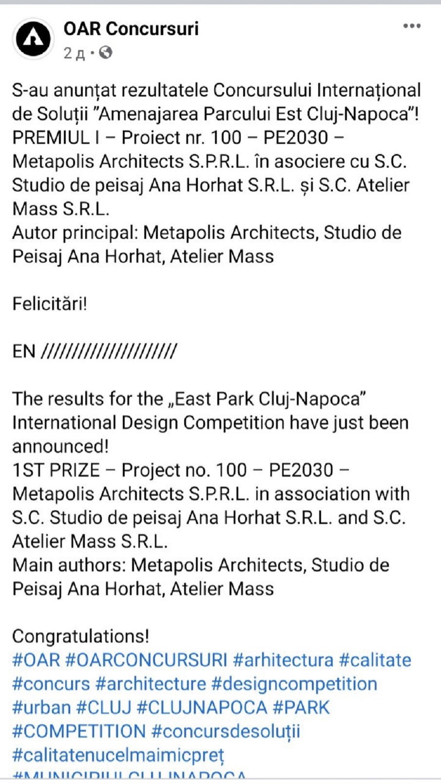 Въпреки възторжените медийни публикации, че арх. Борислав Игнатов (общински съветник от ДеБъ и неуспял кандидат за кмет на София) е участвал с впечатляващ проект за градски парк в Клуж, Румъния, той не го е спечелил. Конкурсът е бил международен.