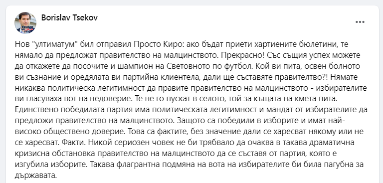 Борислав Цеков съсипа ПП-тата: Кой ви пита, освен болното ви съзнание и оредялата ви партийна клиентела, дали ще съставяте правителство?!