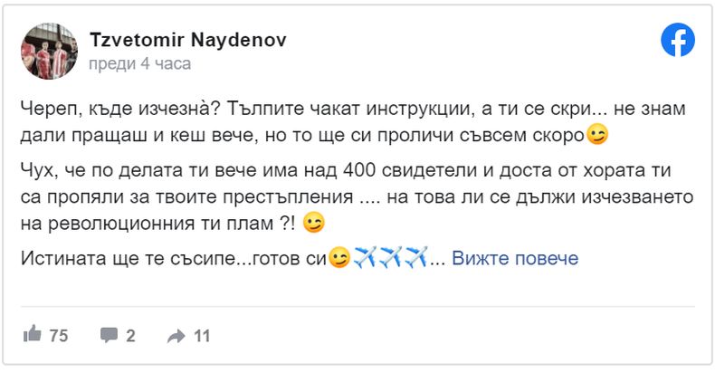 "Череп, къде изчезна̀? Тълпите чакат инструкции, а ти се скри... не знам дали пращаш и кеш вече, но то ще си проличи съвсем скоро", написа във фейсбук босът на "ЕФбет"Цветомир Найденов и бивш съдружник на забегналия в Дубай Васил Божков.