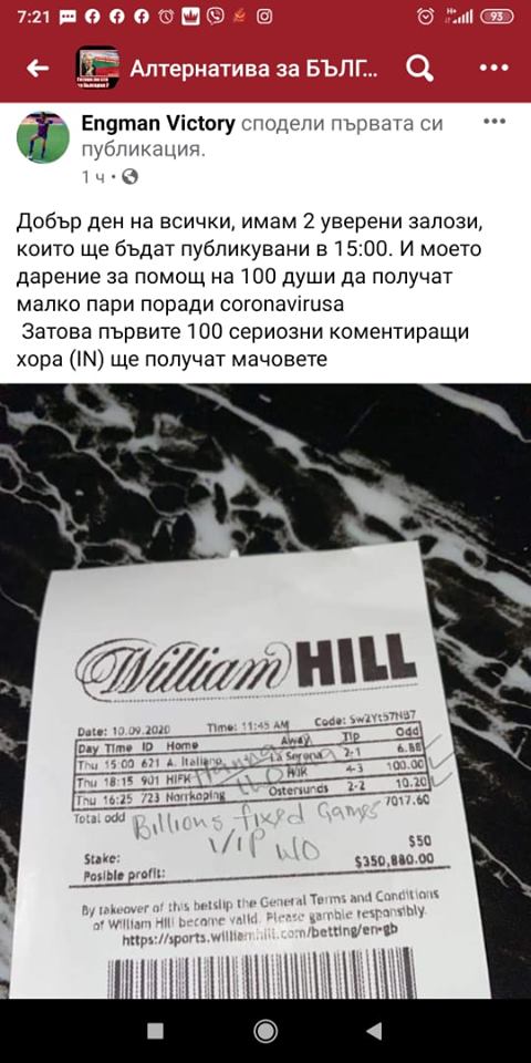 "Добър вечер на всички, имам 2 уверени залози, които ще бъдат публикувани в 15:00. И моето дарение за помощ на 100 души да получат малко пари поради коронавируса. Затова първите сериозни коментиращи хора (IN) ще получат мачовете". Такова примамливо предложение на лични съобщения в месинджър получават много потребители на Фейсбук. Съобщението е от профил Engman Victory, който още от пръв поглед се вижда, че е фалшив, правописът е автентичен.