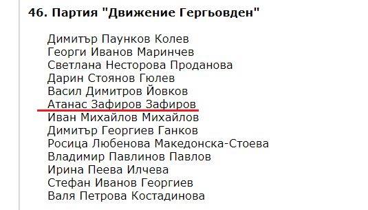 Това сочи списъкът с кандидати за общински съветници на политическата сила, създавена от Любен Дилов-син, за местните избори през 2003 г. в Бургас. Бюлетината, с която тогава се е гласувало за "Гергьовден" е под №46. А шести в списъка за общинари на партията е именно Атанас Зафиров.