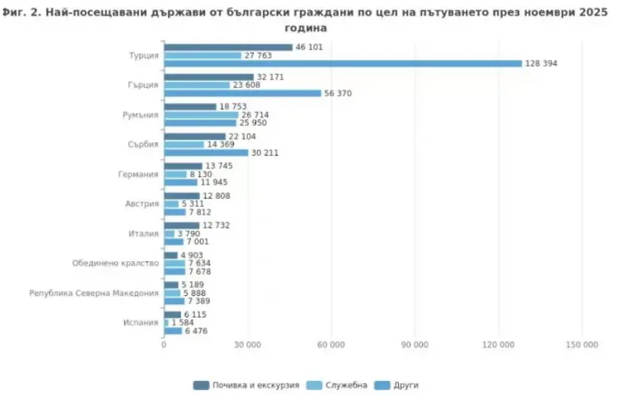 Българските граждани са пътували най-често до Турция и Гърция през ноември. Това сочат данните на Националния статистически институт (НСИ). Най-голям брой пътувания са осъществени към Турция - 202 258, Гърция - 112 149, Румъния - 71 417, Сърбия - 66 684 и други, т.е. българите най-често излизат от страната ни в посока на съседните държави. Общият брой пътувания са около 675 700, или с 5.8% повече в сравнение с ноември 2024 г.