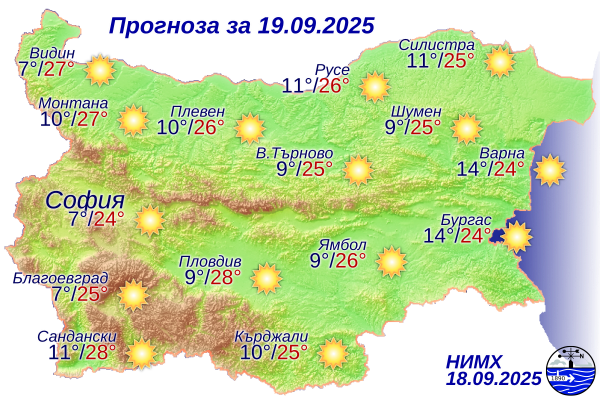 През деня ще бъде слънчево. Ще духа слаб до умерен вятър от север-северозапад. Максималните температури ще бъдат между 23° и 28°, за София - около 24°.