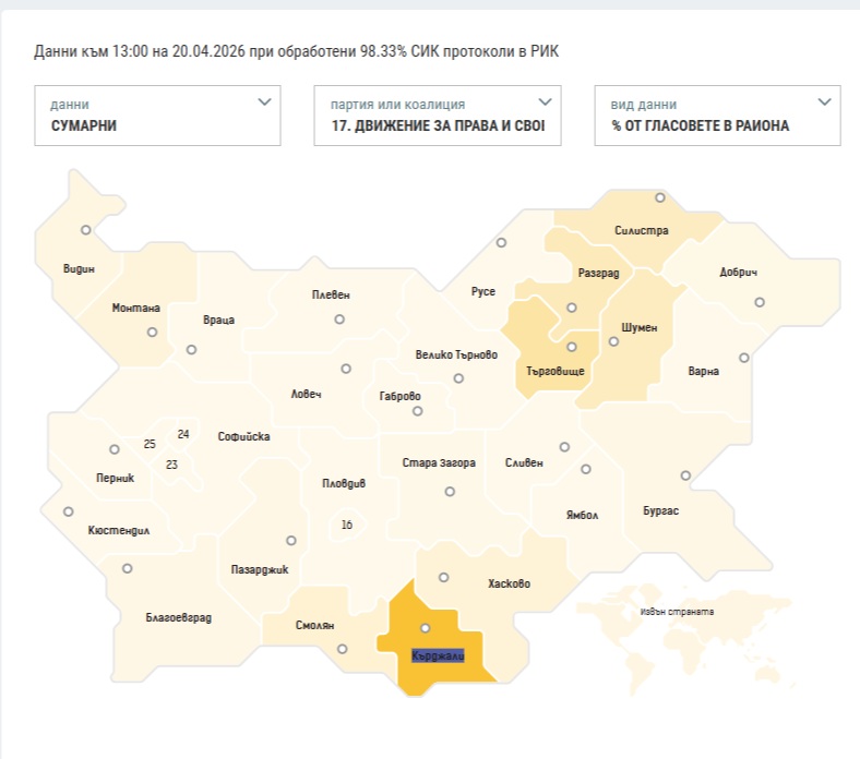 Най-солиден обаче е резултатът на ДПС в област Кърджали. Там партията на Делян Пеевски е първа сила с над 58% подкрепа.