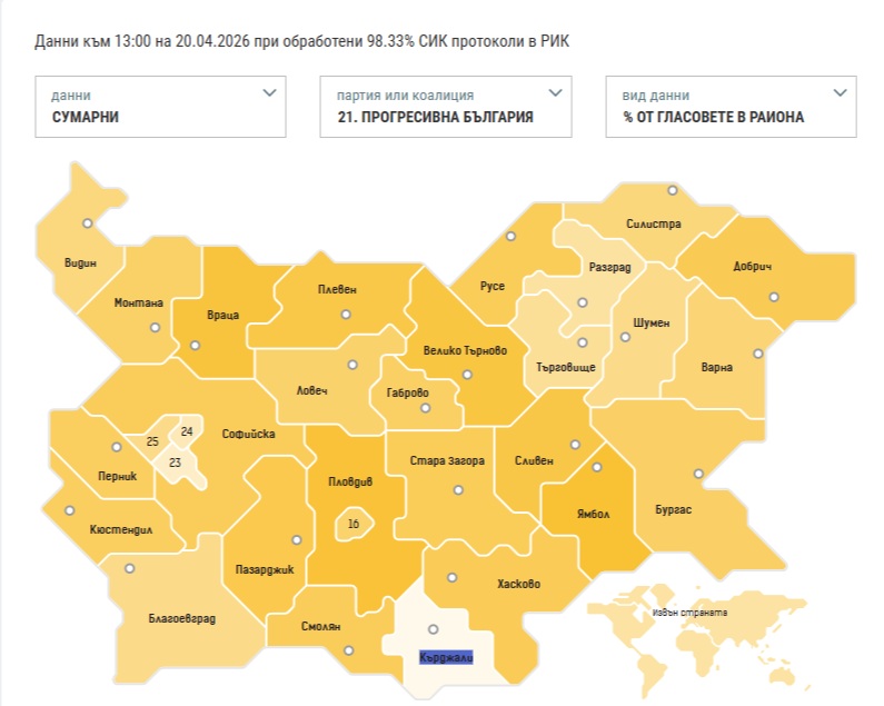Очаквано "Прогресивна България" взима първото място във всички райони, с изключение на един - Кърджали.Най-солиден е успехът на Радев в област Ямбол, където взима 55% от гласовете на избирателите.