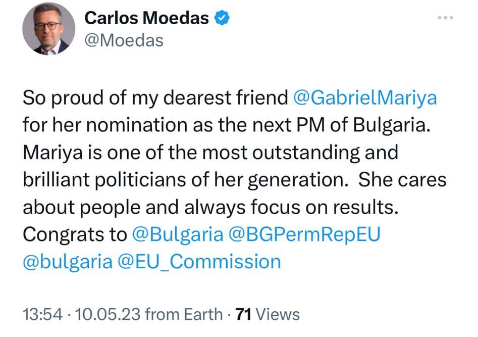 "Горд съм от номинацията на моята най-скъпа приятелка Мария Габриел за следващ министър-председател на България. Мария е една от най-изключителните и брилиянтни политици от нейното поколение. Хората са важни за нея винаги се фокусира върху резултатите. Поздравления", написа кметът на Лисабон Карлос Моедас.